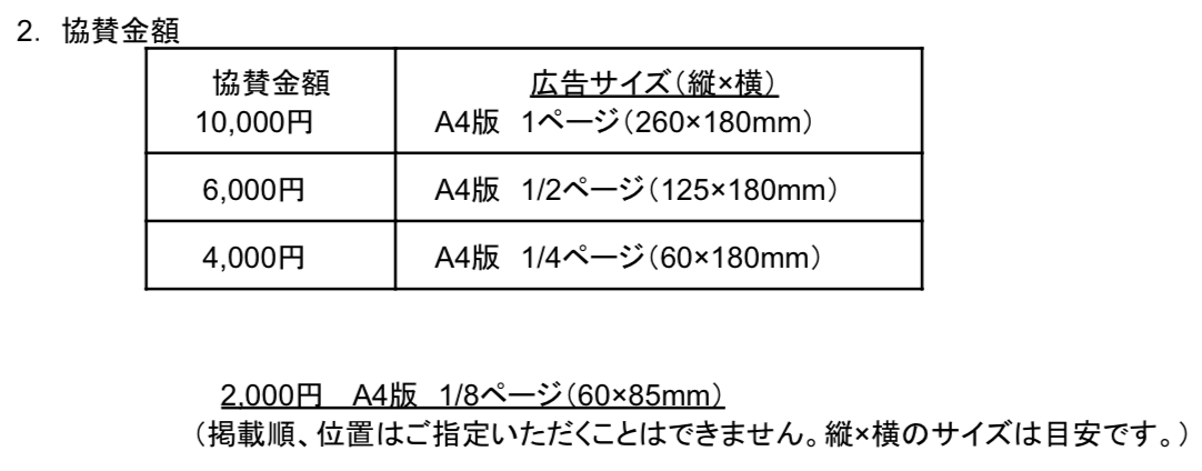協賛いただいた企業様、法人様、団体様につきましては協賛いただいた金額に応じたサイズで大会プログラ ムに広告を掲載させていただきます。